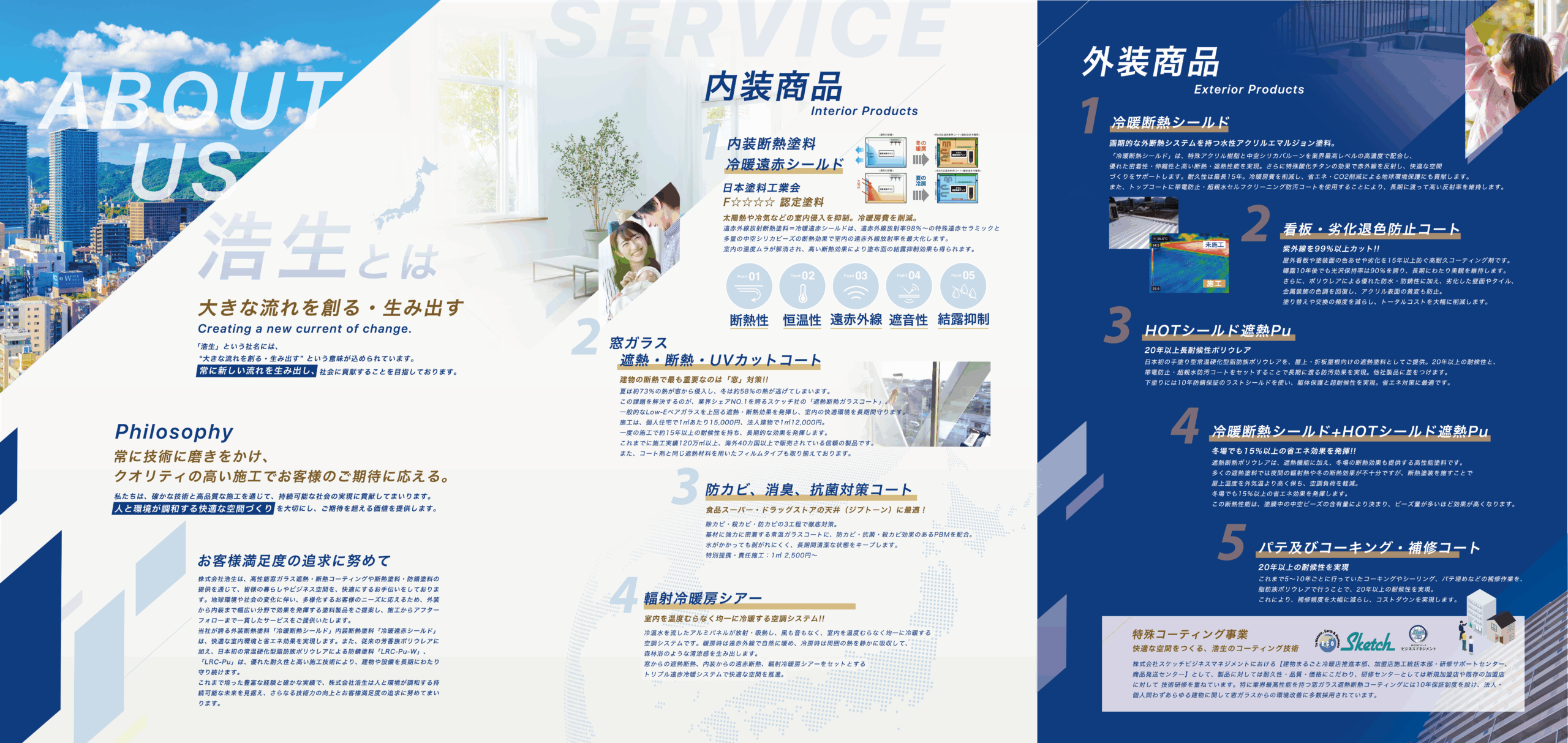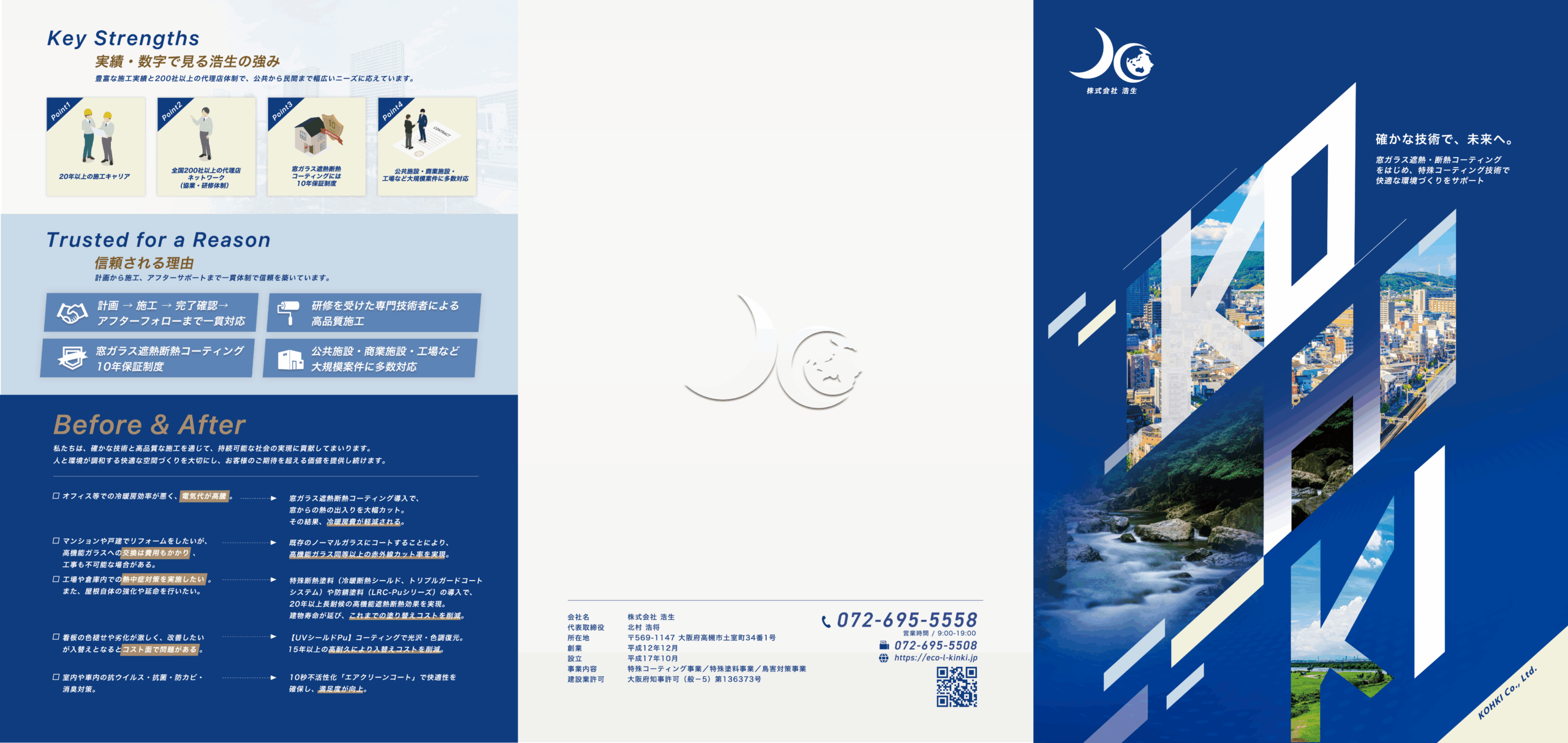 既存のフライヤーに使用されていた大阪府高槻市の街並みや滝のイメージを継承し、地域に密着した企業姿勢を明確に示すとともに、外装・内装コーティング技術の多様な領域を力強く表現。ネイビーブルーを基調に、安心感と専門性を感じさせるデザインへと再構築しました。